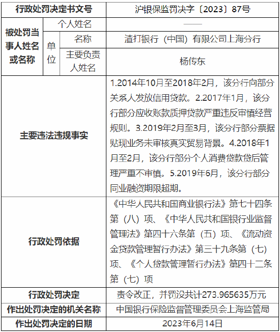 6月21日金融一线消息,据国家金融监督管理总局网站发布的行政处罚信息公开表显示,渣打银行(中国)有限公司上海分行因违法违规被监管责令改正,并罚没共计273.965635万元。根据披露,该行的主要违法违规事实如下:1.2014年10月至2018年2月,该分行向部分关系人发放信用贷款。2.2017年1月,该分行部分应收账款质押贷款严重违反审慎经营规则。3.2019年2月至3月,该分行部分票据贴现业务未审核真实贸易背景。4.2018年1月至2月,该分行部分个人消费贷款贷后管理严重不审慎。5.2019年6月,该分行部分同业融资期限超期。