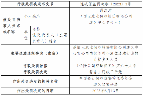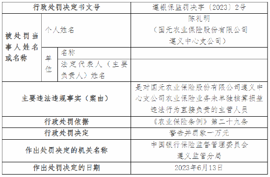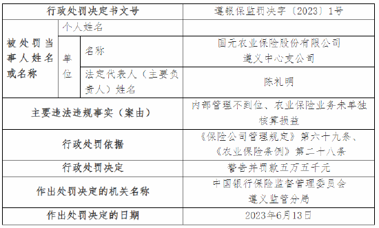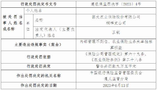 另外,国元农业保险股份有限公司桐梓支公司因内部管理不到位、农业保险业务未单独核算损益,被监管警告并罚款九万五千元;王锐是对国元农业保险股份有限公司桐梓支公司内部管理不到位、农业保险业务未单独核算损益违法行为直接负责的主管人员,被警告并罚款三万三千元。