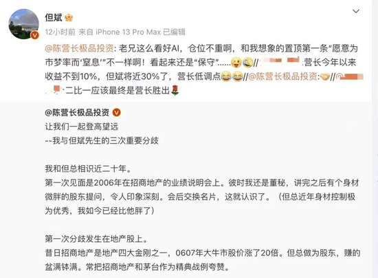 6月21日凌晨,两位私募大V但斌、陈宇,再次就AI仓位、业绩等问题在微博隔空“互撕”。