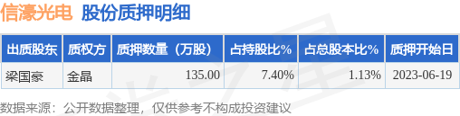 信濠光电(301051)6月21日公开信息显示,股东梁国豪向金晶合计质押135.0万股,占总股本1.13%。质押详情见下表: