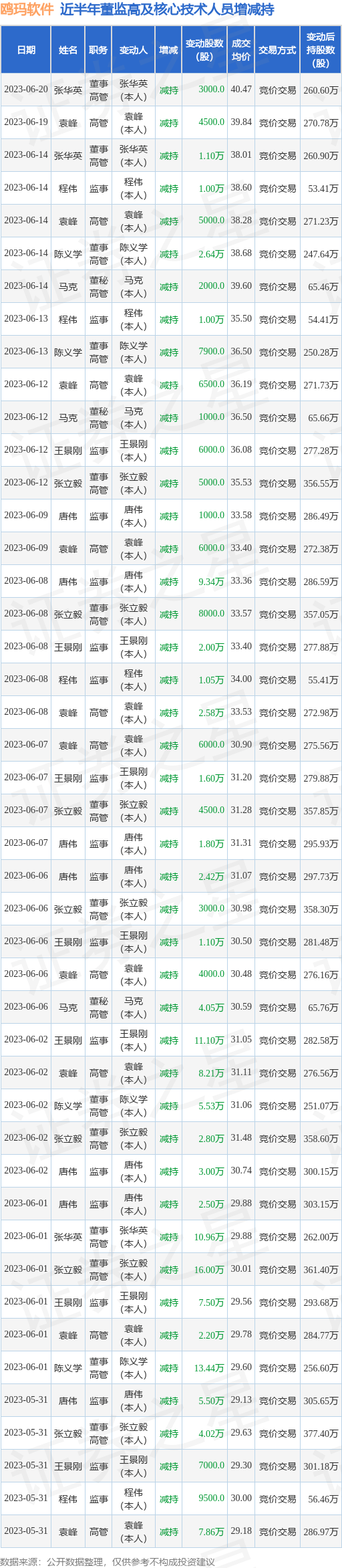 鸥玛软件近半年内的董监高及核心技术人员增减持详情如下: