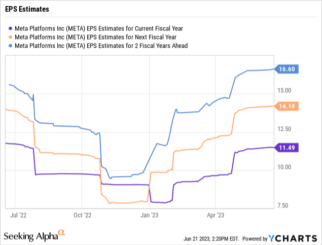 自去年10月Meta Quest Pro发布以来,Meta已经从低点反弹了190多美元。这款设备是一个重大失败,但这家社交媒体公司仍然在执行与苹果不同的产品路径。就在低点之后,Meta又推出了另一款AR/VR设备,而苹果仍在宣传明年某个时候正式发布一款产品。令人惊讶的是,Meta已经卖出了2000万台设备,而苹果公司正在努力发布一款明年需求仅为10万台左右的产品。不管怎样,对Meta的股东来说,轻松赚钱的日子已经结束了。根据分析师对每股收益的估计,Meta目前的股价为20x 2024每股收益目标14.18美元。分析师预测,在去年10月最初的预期跌至10美元以下后,2025年每股收益将再次大幅增长至16.60美元。