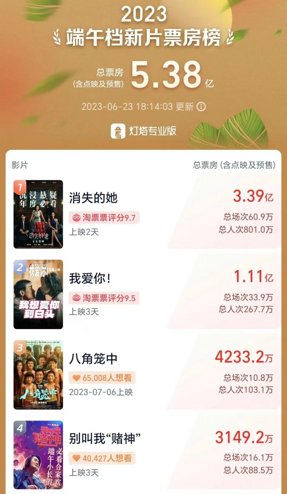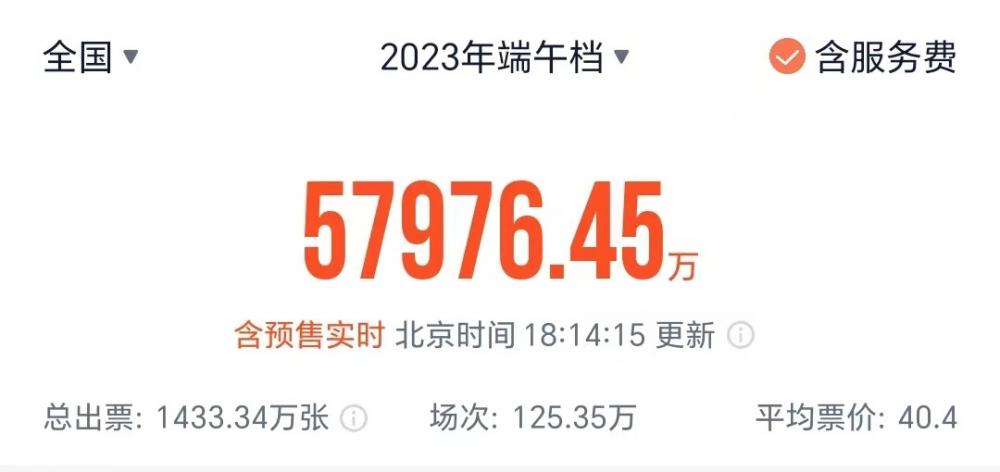 截至6月23日18点,2023年端午档期票房(含点映及预售)近5.8亿元,其中端午档上映的新片票房近5.4亿元。