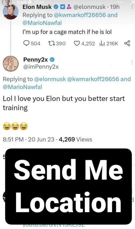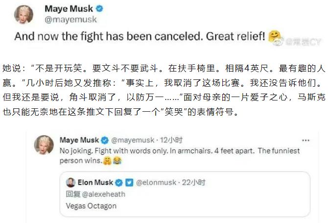 她说:“不是开玩笑。要文斗不要武斗。在扶手椅里。相隔4英尺。最有趣的人赢。”几小时后她又发推称:“事实上,我取消了这场比赛。我还没告诉他们。但我还是要说,角斗取消了,以防万一……”面对母亲的一片爱子之心,马斯克也只能无奈地在这条推文下回复了一个“笑哭”的表情符号。