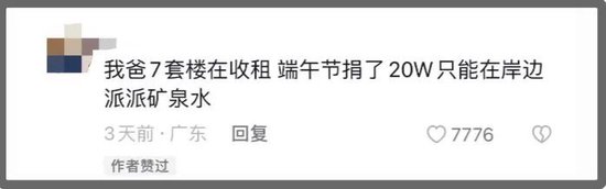有网友表示,“我爸7套楼在收租,端午节捐了20w,只能在岸边派派矿泉水”。
