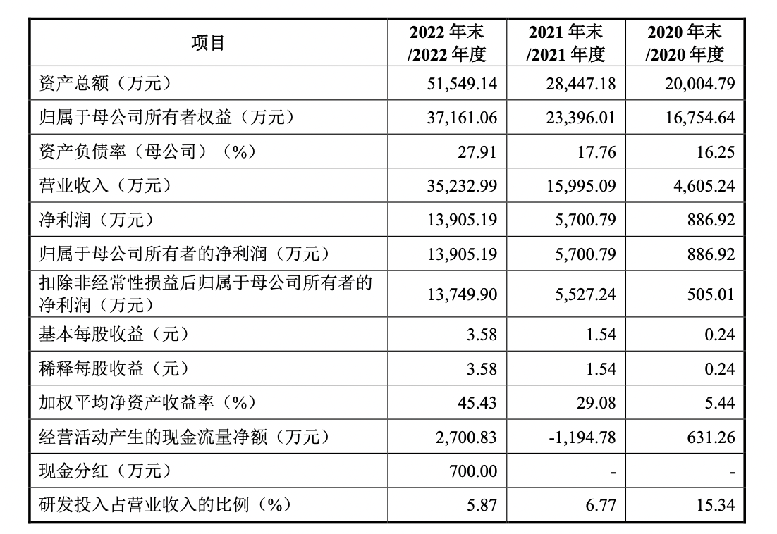 据乐居财经《预审IPO》查阅招股书,2020年-2022年,赢双科技实现营业收入分别为4605.24万元、1.6亿元、3.52亿元;归属于母公司所有者的净利润分别为886.92万元、5700.79万元、1.39亿元。