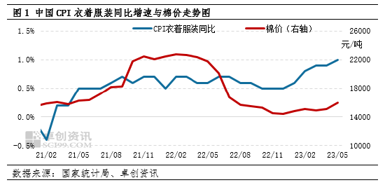 国内货币环境宽松,消费处于温和复苏阶段,5月国内纺织品服装消费继续好转。国家统计局最新数据显示,5月全国居民消费价格同比上涨0.2%,其中衣着服装同比上涨1%,环比上涨0.4%,显示出国内服装消费需求继续恢复的特点。通过数据分析可以发现,剔除2021/22年度因抢收引起的棉价冲高回落,CPI衣着服装同比增速与棉价走势具有中度相关性,其中2021年2-8月相关性系数为0.6,2022年12月以来相关系数为0.69。主要逻辑是随着国内服装消费需求稳定向好,棉花供需关系改善,支撑棉花产业链价格共振上涨。卓创资讯监测数据显示,5月3128B级皮棉全国均价15985元/吨,普梳高配32支棉纱全国均价24000元/吨,较1月均价涨幅分别为8.09%和4.22%。
