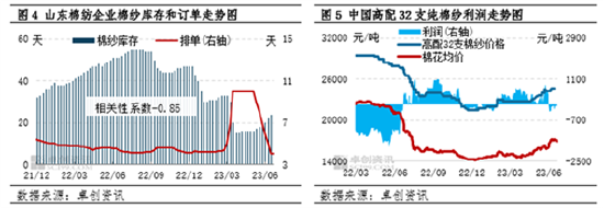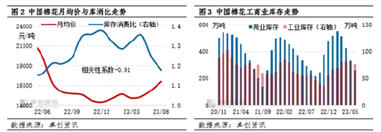 今年以来,棉花市场供需关系明显改善,支撑棉价偏强。据卓创资讯监测,5月底全国棉花商业、工业库存分别为331.44万吨(4月底库存修正为425.67万吨)、81.28万吨,环比上月底分别减少22.14%、0.57%;6月初全国棉花供需平衡表数据显示,2022/23年度库存消费比小幅下降0.06至1.16。棉花月均价与库消比高度负相关,棉花去库存速度加快,支撑现货价格触底反弹,带动产业链价格共振上涨。另外,2023/24年度棉花减产预期一致,棉价上涨预期偏强,贸易企业主动提涨,棉纺企业逢低积极备货,轧花企业包厂积极性提高,新棉上市抢收概率较大,也支撑棉价延续涨势。因棉花供需关系改善,加之供应预期收紧,棉价上涨动能仍在,但需求端利空影响逐渐发力,淡季棉价波动幅度或将加大。