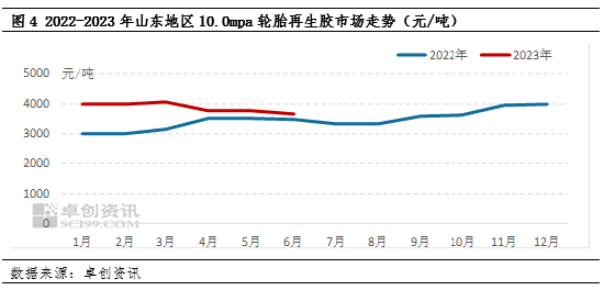 从轮胎再生胶情况来看,在原材料废轮胎价格的支撑下, 2023年1-6月份轮胎再生胶的市场价格普遍高于2022年同期水平,但是1月份至今,再生橡胶市场整体呈现下滑走势。根据卓创资讯监测,6月份山东地区10.0mpa轮胎再生胶出厂3650-3700元/吨,较上半年高点3月份的市场价格下跌375元/吨左右,跌幅9.26%。据了解,5月份以来轮胎再生胶出货不畅,厂家多下调出厂价格,以此增加库存消耗。同时,再生胶厂家降产以此避免累库,开工积极性下滑明显。随着传统淡季的到来,终端对再生胶的需求下滑,市场进入低位整理阶段。