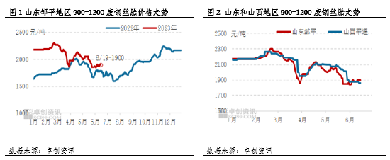 经过5月的弱势下跌,废旧橡胶市场在6月份趋稳,900-1200废钢丝胎市场呈现震荡整理态势,其中山东邹平市场废钢丝胎价格窄幅走高。根据卓创资讯监测数据,截止到6月19日,山东邹平地区900-1200废钢丝胎到厂1900元/吨,较5月31日价格上涨50元/吨,涨幅2.70%;高出2022年同期水平110元/吨,上涨6.15%。6月份是废旧橡胶行业传统淡季,市场成交价格往往处于年中低位。2023年山东邹平地区900-1200废钢丝胎市场走势基本与2022年吻合,进入低位盘整阶段。