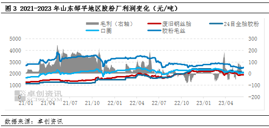 从胶粉厂的情况来看,2022和2023年山东邹平地区胶粉厂利润下滑明显,根据卓创资讯监测数据显示,截至目前2023年山东邹平地区胶粉厂利润水平为13元/吨左右,较2021年1-6月份胶粉厂利润水平88元/吨来看,平均一吨胶粉利润空间下滑75元。因此厂家开工积极性较差,从而拖累废轮胎需求。