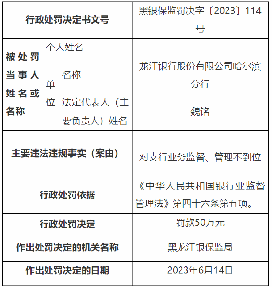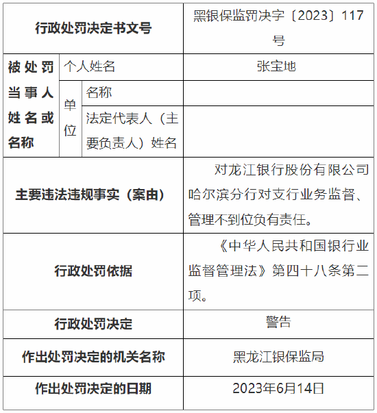 6月25日金融一线消息,据国家金融监督管理总局网站发布的行政处罚信息公开表显示,龙江银行哈尔滨分行因对支行业务监督、管理不到位,被监管罚款50万元;同时,张宝地 、赵平二人对上述违法行为负有责任,被监管警告。