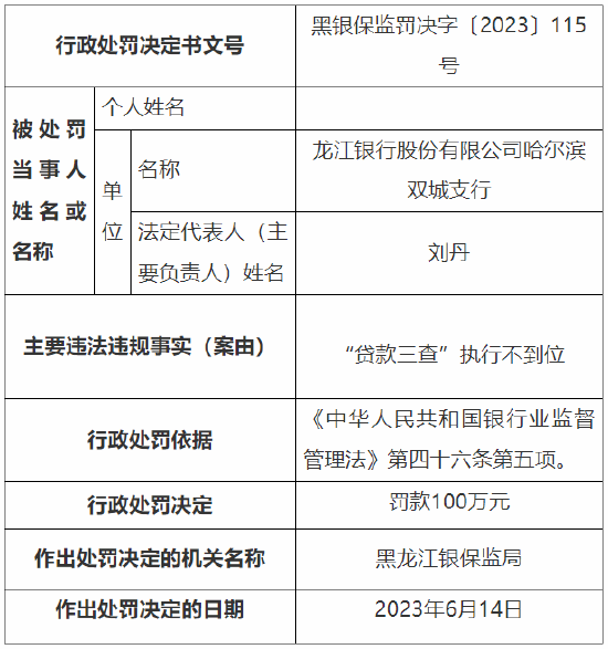 同日,龙江银行哈尔滨双城支行因“贷款三查”执行不到位,被监管罚款100万元;同时,芦振对上述违法行为负有责任,被监管警告。