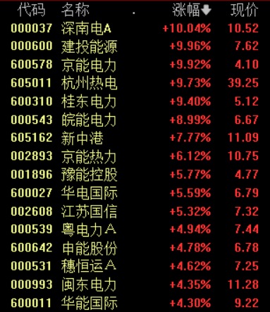截至发稿,深南电A、建投能源、京能电力涨停,桂东电力(维权)、皖能电力、新中港等纷纷跟涨。