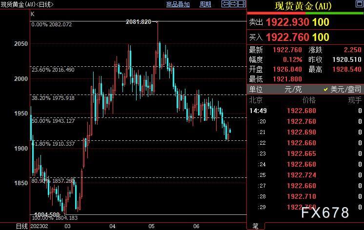 汇通财经APP讯——周一(6月26日),国际金价小幅上涨,美元走弱使得美元计价商品对海外投资者变得更具吸引力,短线或反弹至1943美元。但由于交易员评估美联储进一步加息的前景,金价距离上周创下的3月中旬以来低点1910.01美元/盎司不远。北京时间14:50,现货黄金上浮0.05%至1922.27美元/盎司;COMEX期金主力合约上涨0.12%至1931.9美元/盎司;美元指数下跌0.10%至102.767。