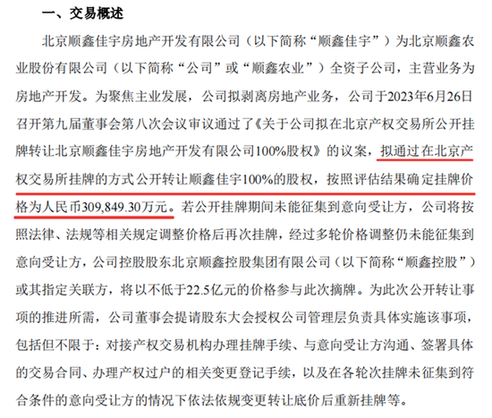 6月26日晚间公告显示,为聚焦主业发展,公司拟剥离房地产业务,拟通过在北京产权交易所挂牌的方式,公开转让顺鑫佳宇100%的股权,按照评估结果确定挂牌价格为30.98亿元。