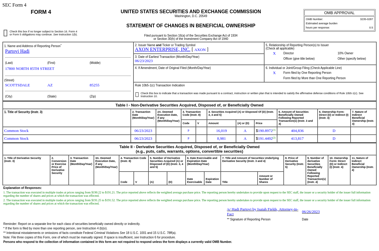 6月27日报道,根据美国证券交易委员会(SEC)6月26日披露的文件,$Axon Enterprise(AXON.US)$董事Partovi Hadi于6月23日以每股平均价191.0955美元增持2.5万股普通股股份,价值约为477.74万美元。