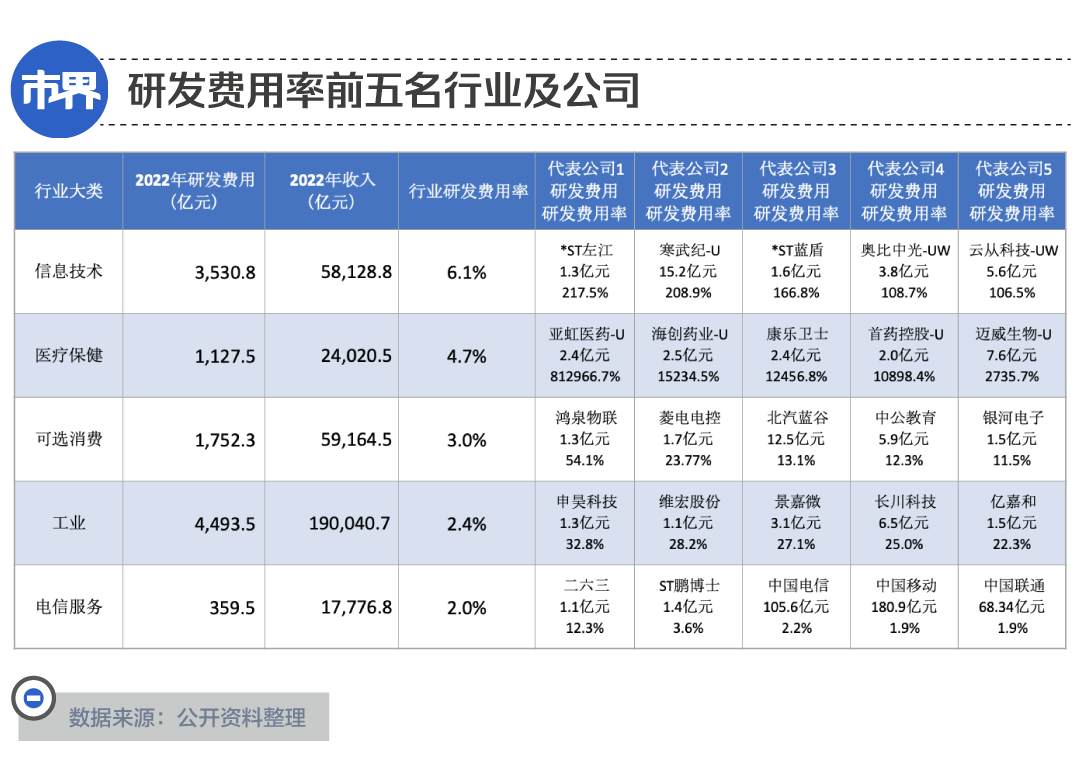 如果用15个Wind一级行业的研发费用总数与收入总数进行比较,那么排名前五的行业依次是信息技术、医疗保健、可选消费、工业和电信服务,研发费用占收入比重从2%到6%不等,其中各行业大类下研发费用率居于前5且绝对值大于1亿元的上市公司如下图所示,相对出名的比如寒武纪、云从科技、中公教育(维权)、中国移动等等。