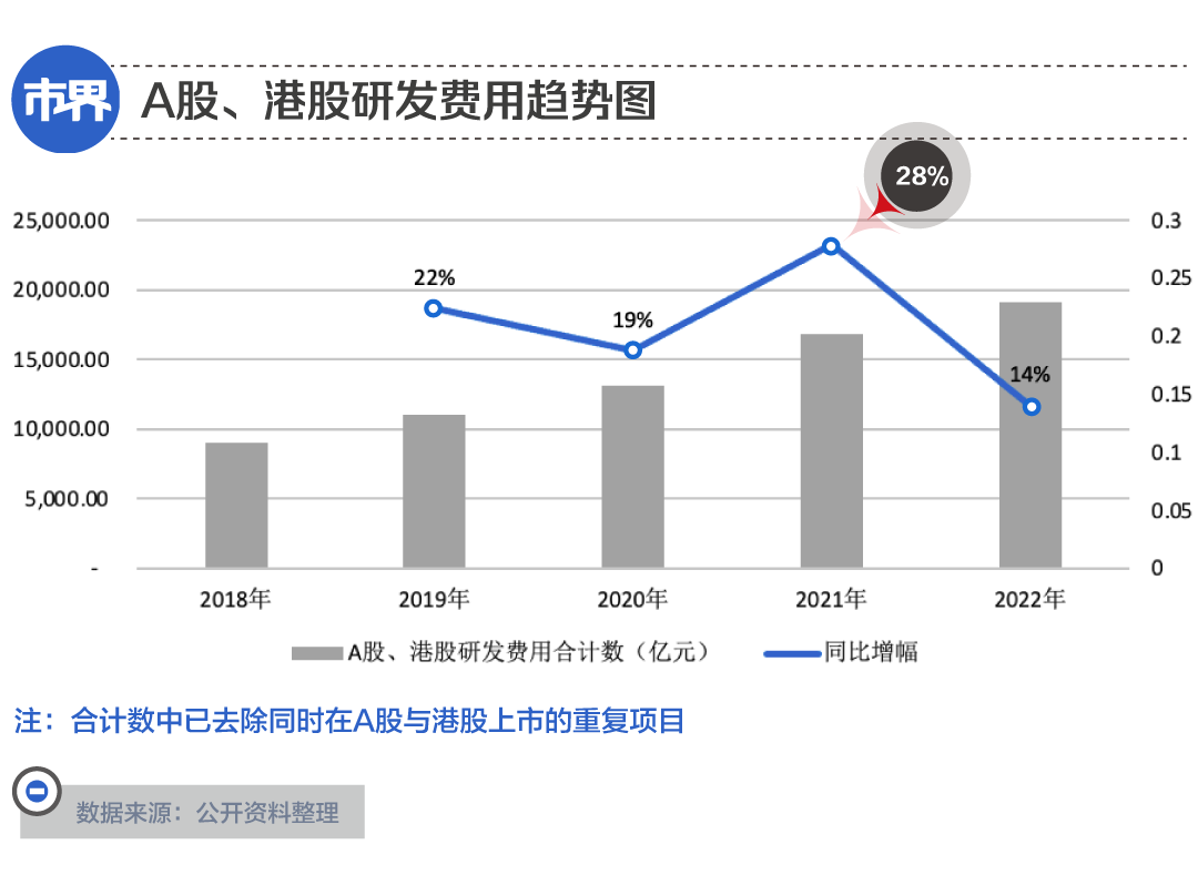 如果去除同时在两地上市的公司重复计算的研发费用,那么2022年A股和港股研发费用合计约为1.9万亿元,同比增长14%,但增幅较过去三年其实已经出现了明显的下滑。