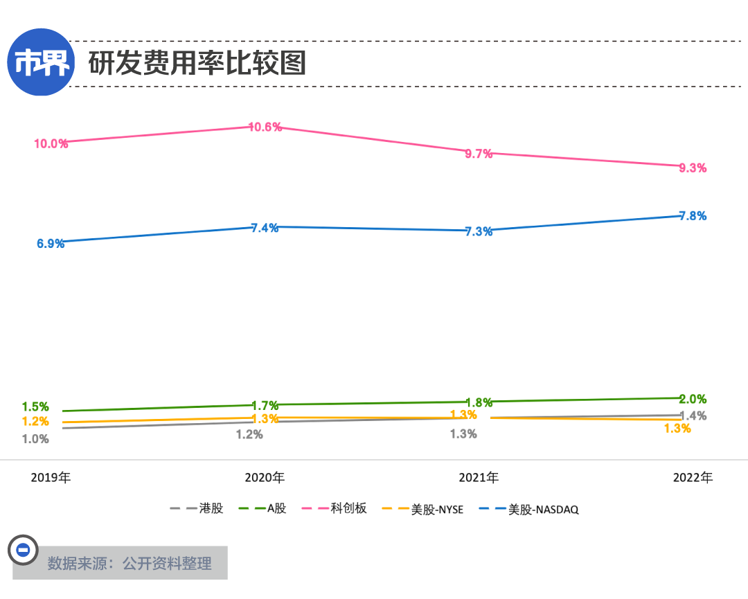 除此之外,港股、美股的整体研发费用率也都高于A股,但其中也有因为板块不同导致的客观原因,如在美国纳斯达克上市近4000家上市公司,研发费用率就达到7.8%的高水平,与科创板相近,但在美国纽交所上市的近2200家上市公司,对应指标就只有1.3%。
