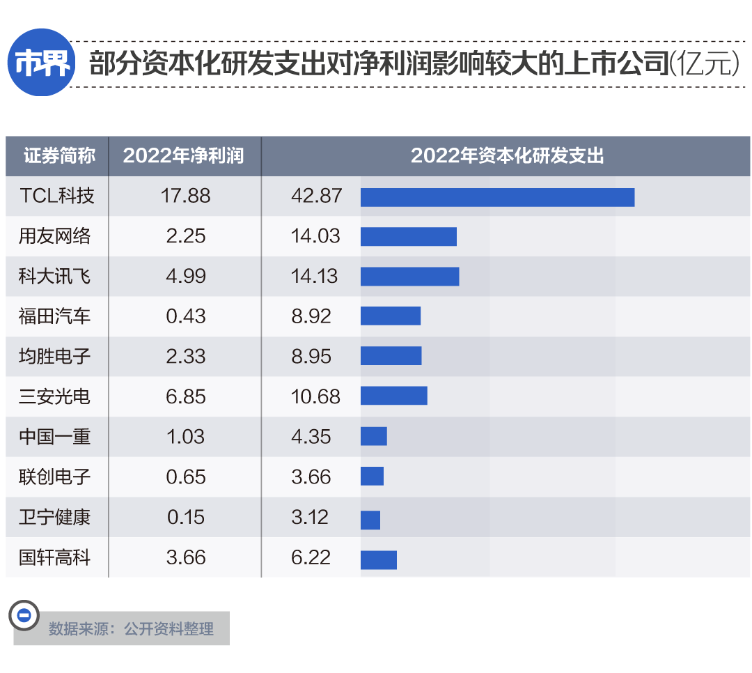 如下图所示,均为2022年净利润为正,资本化研发支出金额大于净利润金额,且差额大于2亿元的上市公司。
