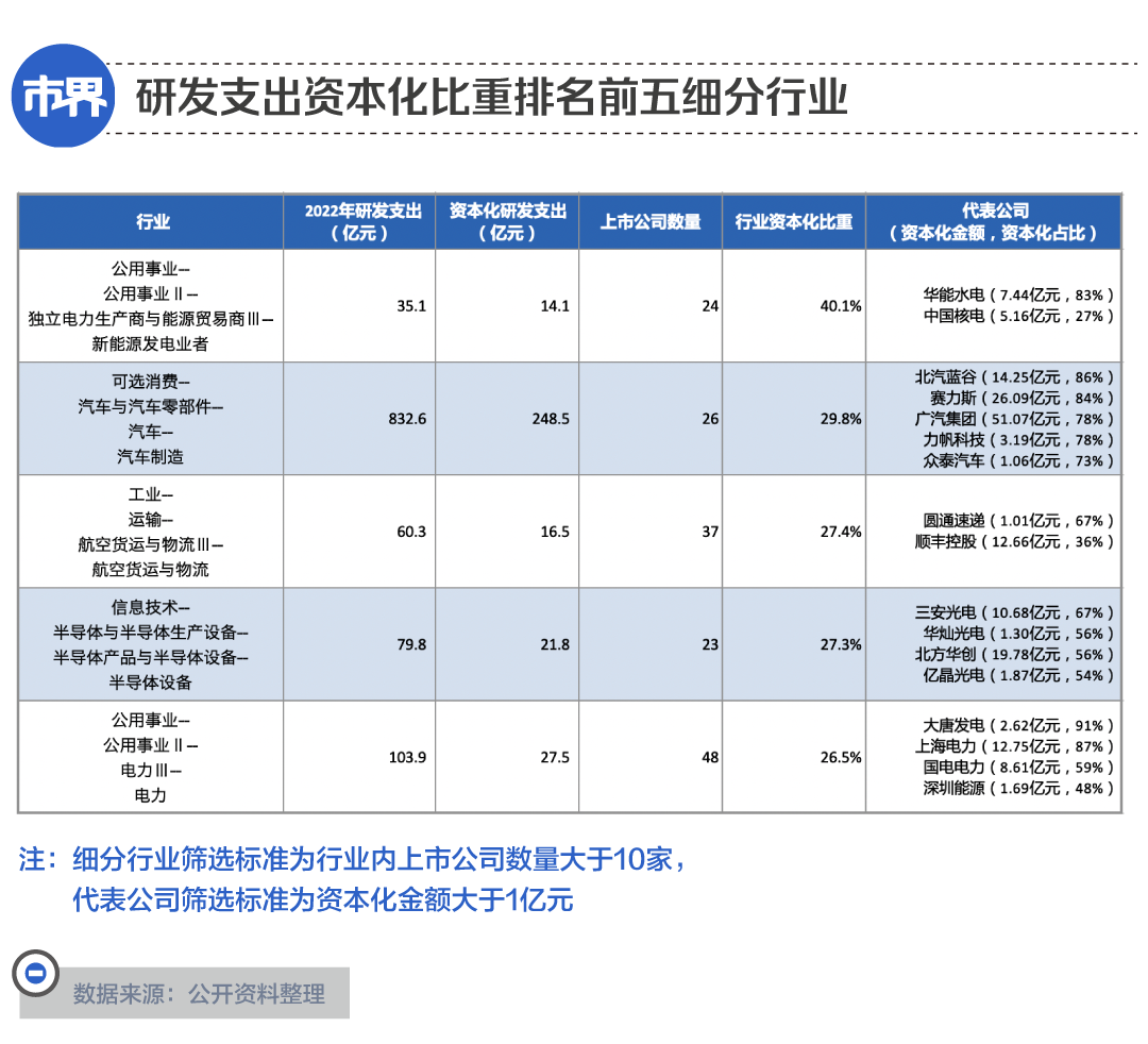 从比例来看,如果剔除上市公司数量10家以下、绝对值低于1亿元的细分行业,那么新能源发电业者、汽车制造、航空货运与物流、半导体设备和电力,则是研发开支资本化比重最高的几个行业。