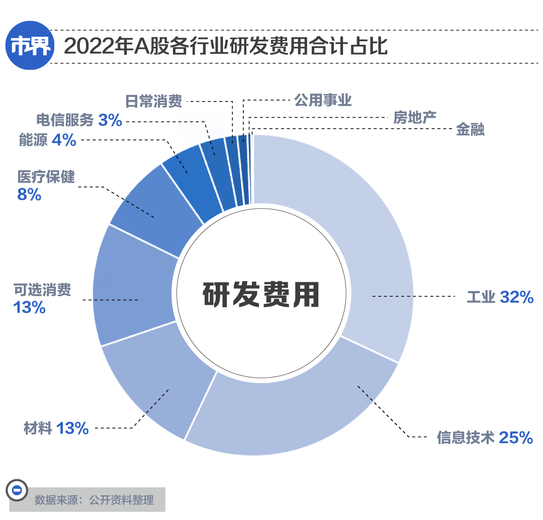 如果分行业来,大A股合计1.4万亿元的研发费用中,有接近三分之一花在了工业领域,其次是占比25.09%的信息技术行业、占比12.77%的材料行业和占比12.48%的可选消费行业。