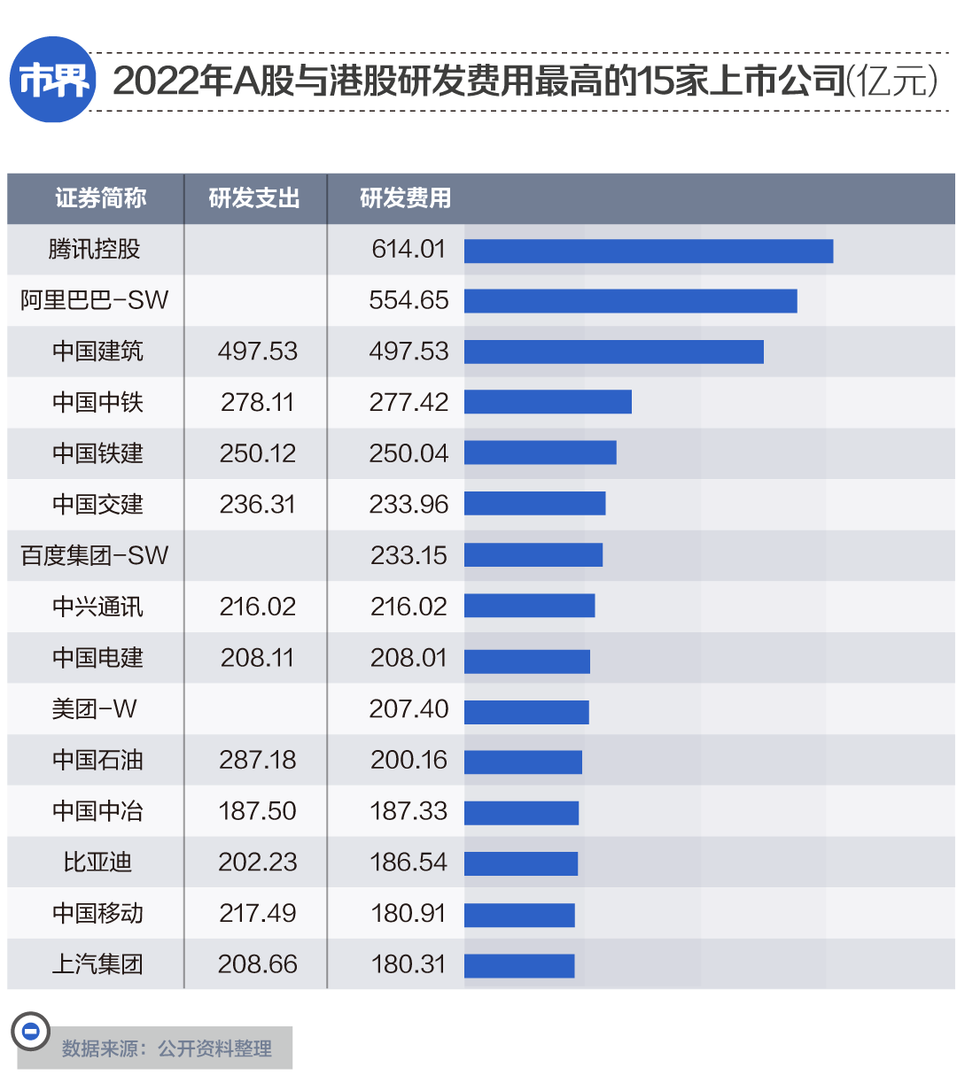 从单家公司的研发费用排名来看,A股与港股研发费用最高的15家上市公司如下图所示,腾讯控股、阿里巴巴两家互联网巨头居首,中国移动和上汽集团收尾,中间穿插着众多中字头企业和两家互联网公司。