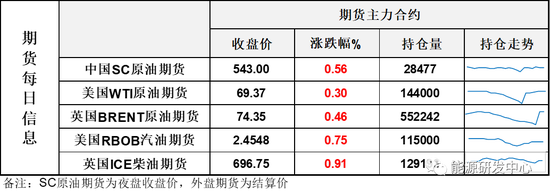 【1】WTI主力原油期货收涨0.21美元,涨幅0.3%,报69.37美元/桶;布伦特主力原油期货收涨0.34美元,涨幅0.46%,报74.35美元/桶;INE原油期货收涨0.56%,报543元。