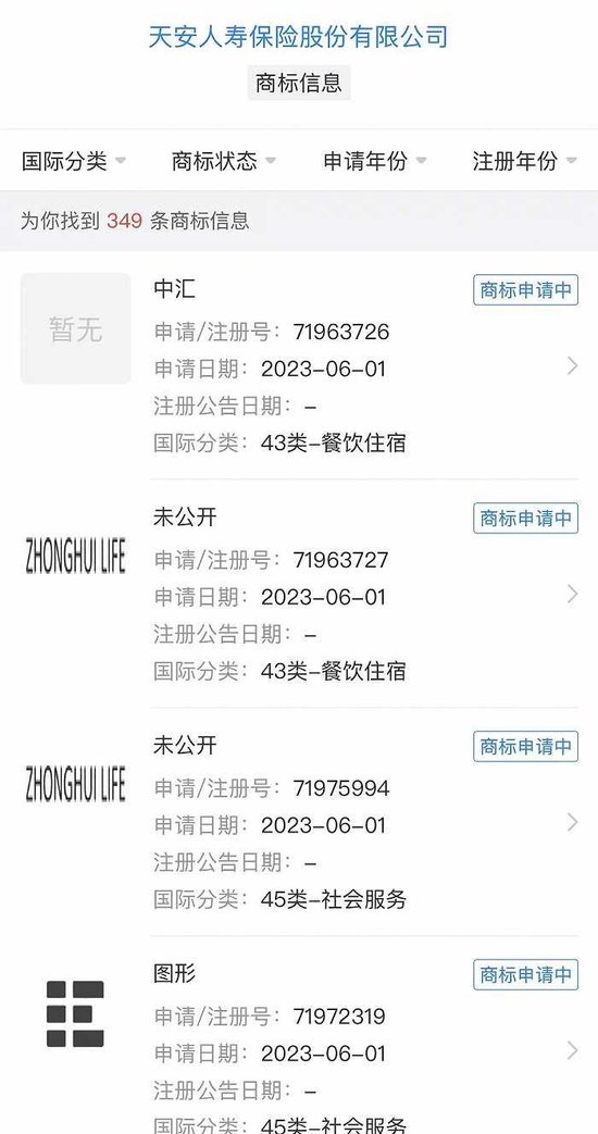 天眼查信息显示,自今年5月31日以来,天安人寿申请了系列商标,其中涉及“ZHONGHUI LIFE”、“中汇”等商标名称或商标图案。