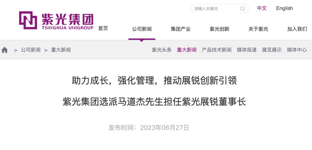 6月27日,紫光集团在官网发布消息称,紫光集团委派集团执行副总裁马道杰任紫光展锐董事并选派其为紫光展锐董事长。原由紫光集团委任的紫光展锐董事吴胜武不再担任紫光展锐董事、董事长。