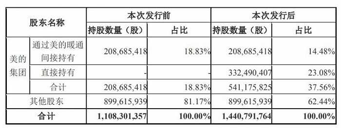 截至发行预案公告日,美的集团通过美的暖通持有合康新能的股份比例为18.83%。本次发行完成后,美的集团直接及间接持股比例按本次发行的认购数量测算将提升至37.56%。