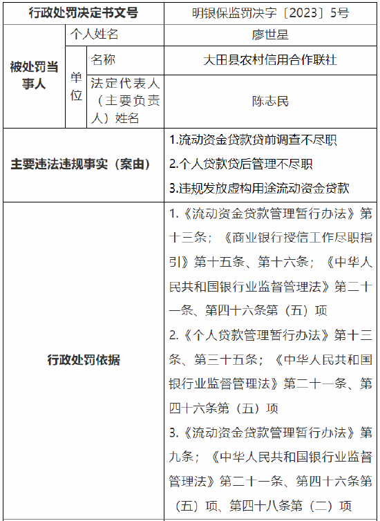 6月27日金融一线消息,据国家金融监督管理总局网站发布的行政处罚信息公开表显示,大田县农村信用合作联社被监管处以110万元罚款,根据披露,该机构的主要违法违规事实(案由)如下: