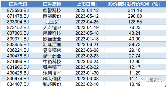 Wind的统计显示,已上市的40只新股中,总共有15只目前股价较发行价上涨10%,其中鼎智科技、巨能股份和民士达上市后表现最为亮眼,目前股价较发行价分别涨3.41倍、2.90倍和1.29倍。