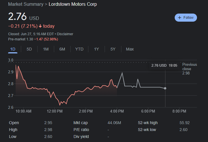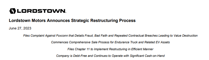 当地时间周二(6月27日),电动汽车初创公司洛兹敦汽车(Lordstown Motors)在官网宣布,已向美国特拉华州破产法院申请启动破产重组程序。