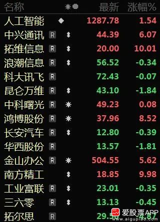 而近期的主线AI,今天依然没怎么反弹。虽然拓维信息涨停,鸿博股份上演大长腿!但几大中军浪潮信息、中际旭创、科大讯飞等还在延续调整!