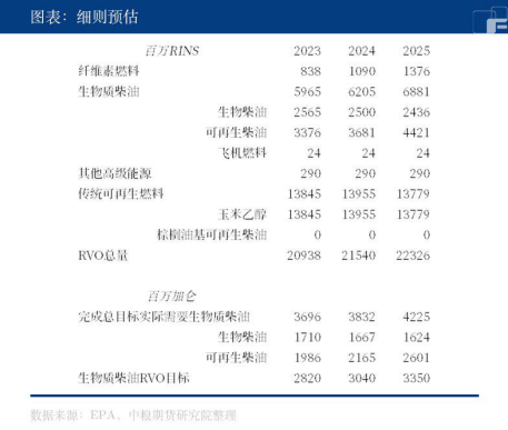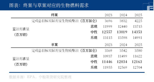 基于上述EPA的预估,以及过往历史数据来映射到美豆油平衡表中生物燃料端的需求是平衡表派的诉求。根据EIA给出的生物柴油端投料比(此处采用过去12个月的均值,主要是考虑到菜油数据的披露以及菜油纳入美国生物柴油体系中),此处假设后续的豆油作为原料占比为43%/45%/47%,并得出以上结论。