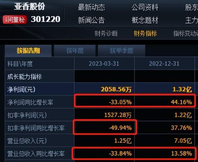 业绩来看,亚香股份2022年双位数增长,不过2023年一季度出现下滑。