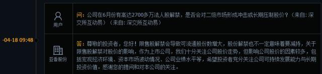 两个月前,在互动平台,有股民提问,公司在6月份有高达2700多万法人股解禁,是否会对二级市场形成冲击或长期压制股价?