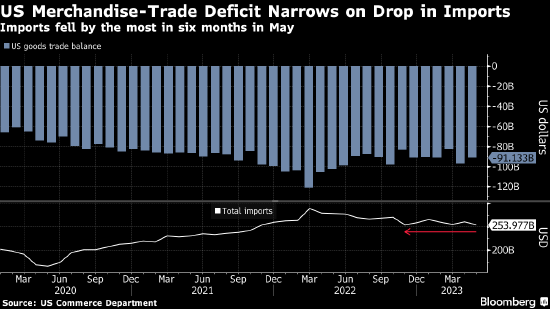 美国商品贸易逆差在5月份的收窄幅度超过预期,因为进口额下降幅度创下六个月来最大。