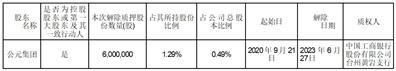 公元股份有限公司(以下简称“公司”)于2023年6月28日接到公司控股股东公元塑业集团有限公司(以下简称“公元集团”)关于股份解除质押的通知,获悉公元集团将其质押给中国工商银行股份有限公司台州黄岩支行的公司股票6,000,000股全部解除了质押,具体事项如下: