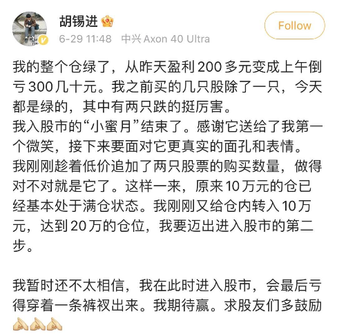 周四(6月29日),虽然三大指数均收跌,成交依旧低迷,但是两市整体超3300只个股上涨,仍算普涨行情。不过,股市新手、媒体老将——胡锡进老师的账户却绿了。对此,网红经济学家李大霄直接给胡锡进老师发了一封信提示:您跳级了,加仓不要赌气。