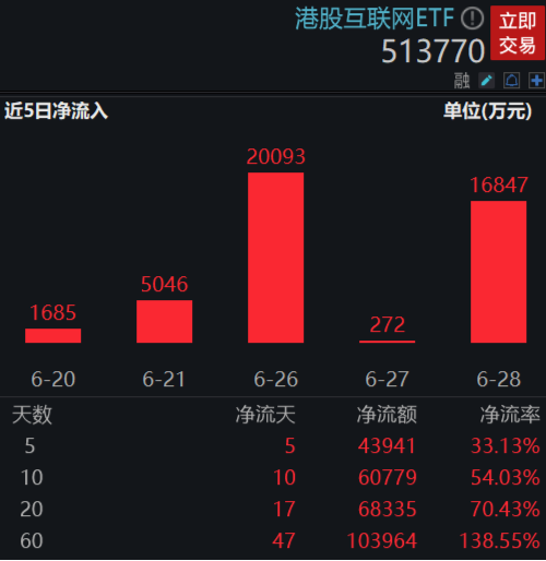 截至6月28日,港股互联网ETF(513770)最新份额增至22.16亿份,年内份额增长达231%;基金最新规模亦快速增至17.25亿元,较去年底同样大增193%,份额、规模较年初均实现翻倍式增长。