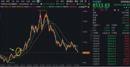 医疗板块依旧低迷。今日中证医疗指数续创逾三年新低,盘中一度失守8500点,幸得午后有所回升,收于8533.65点。