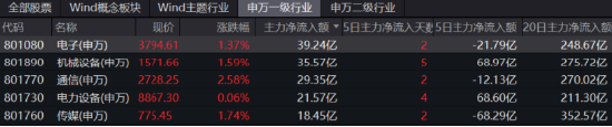 资金方面,电子行业今日获主力净流入39.24亿元,位居31个申万一级行业首位。机械设备行业则紧随其后,其主力净流入额为35.57亿元。通信行业位居第三,其主力净流入额为29.35亿元。主力净流出额居前的行业则为食品饮料(-17.58亿元)、银行(-7.22亿元)、房地产(-6.80亿元)。