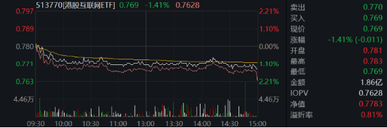 场内热门ETF方面,受大型科技股普遍走低影响,港股互联网ETF(513770)全天水下震荡,尾盘场内价格收跌1.41%,日成交额1.86亿元。