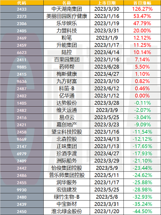 从打新角度观察,上半年仅有12只新股首日收涨,破发率较高。其中,中天湖南集团(02433.HK)首日收涨126.27%,是上半年首日表现最佳的新股,美丽田园医疗健康(02373.HK)和乐华娱乐(02306.HK)分别收涨53.47%、47.79%,位居第二和第三。