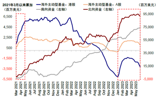1月底至3月中旬,国内经济数据改善偏弱+美国银行业风险推升美元指数,港股回调至去年12月中旬平台位,主动型外资转为净流出,南向持续净流入。