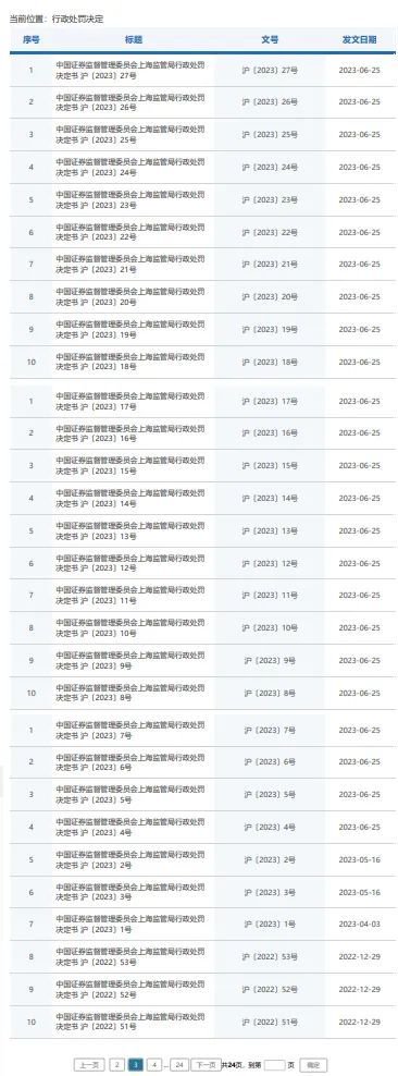 浏览上海证监局官网,行家发现监管处罚栏近半年时间里仅有三则更新。然而,近期上海证监局同一天连更了24份监管处罚决定,编号从沪〔2023〕4号发到了沪〔2023〕27号。