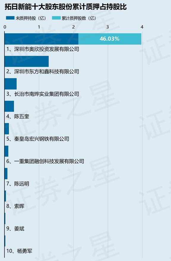 截止本公告日,股东深圳市奥欣投资发展有限公司已累计质押股份1.83亿股,占其持股总数的46.03%。本次质押后拓日新能十大股东的累计质押股份占持股比例见下图: